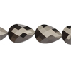 Auf einem Strang sind 50 Stück facettierte, flache Tropfenperlen aufgefädelt. Bei manchen Lichtverhältinissen bekommen diese hematitfarbigen Tropfen einen goldmetalischen Farbstich